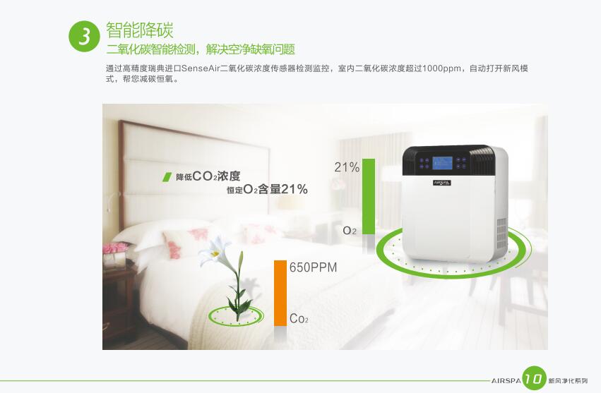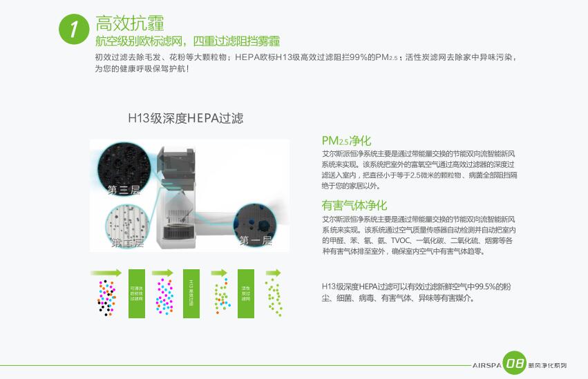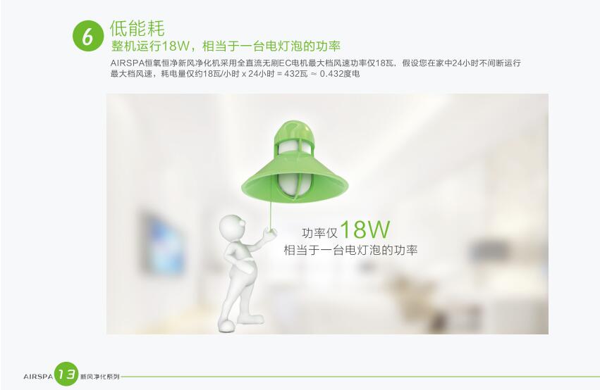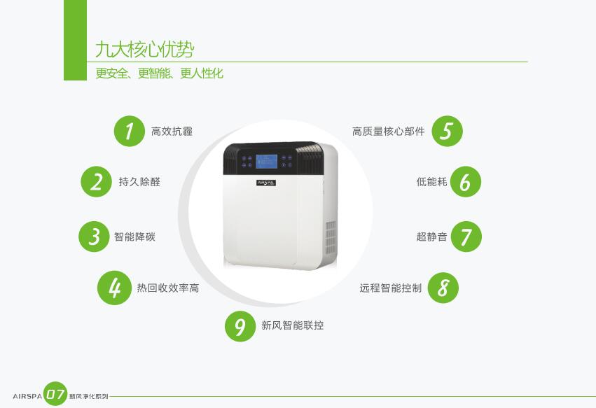 AIRSPA恒氧恒凈新風凈化機秉承節能低碳的理念,采用能量回收裝置,是室內外新污空氣在交換的過程中同時進行能量交換,能量交換率達到了70%以上。