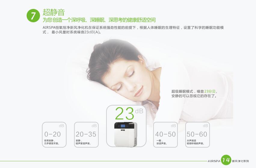 AIRSPA恒氧恒凈新風凈化機在保證系統強勁性能的前提下、根據人體睡眠的生理特征、設置了科學的睡眠功能模式,在此模式下、系統噪音最低只有23Db(A)