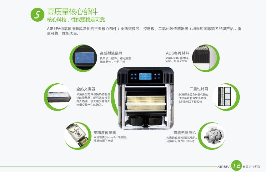 AIRSPA恒氧恒凈新風凈化機主要核心部件(全熱交換芯、控制板、二氧化碳傳感器等)均采用國際知名品牌產品、質量可靠、性能優良。