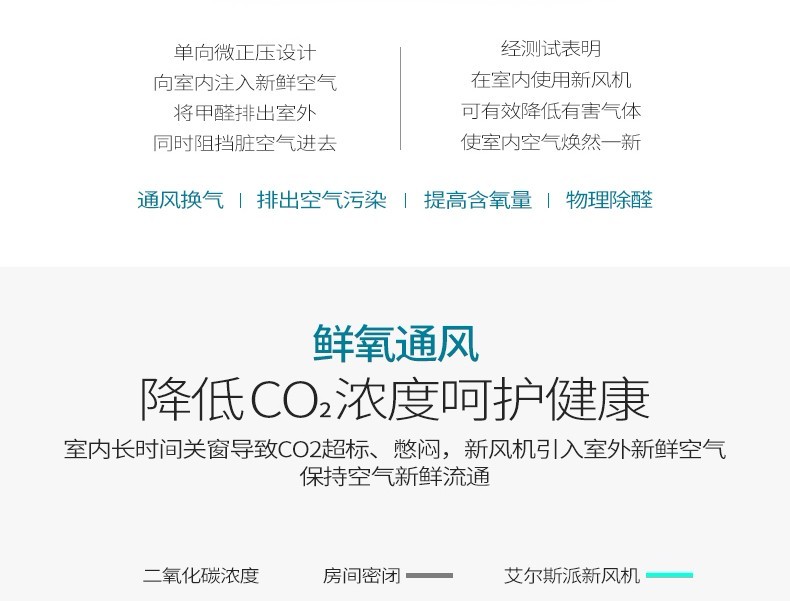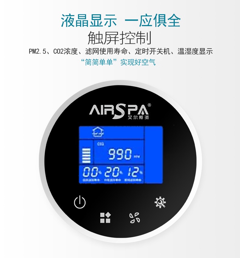 1、液晶顯示:顯示功能、模式、風量大小、室內溫度、濕度、空氣質量、PM2.5濃度顯示、二氧化碳顯示